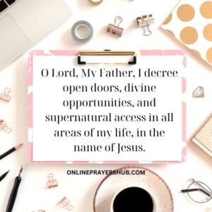 8. O Lord, My Father, I decree open doors, divine opportunities, and supernatural access in all areas of my life, in the name of Jesus.