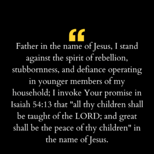 47. Father in the name of Jesus, I stand against the spirit of rebellion, stubbornness, and defiance operating in younger members of my household; I invoke Your promise in Isaiah 54:13 that “all thy children shall be taught of the LORD; and great shall be the peace of thy children” in the name of Jesus.