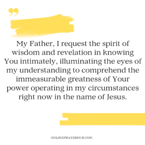 3. My Father, I request the spirit of wisdom and revelation in knowing You intimately, illuminating the eyes of my understanding to comprehend the immeasurable greatness of Your power operating in my circumstances right now in the name of Jesus.