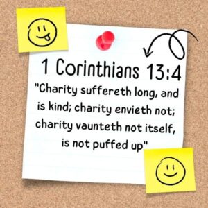 - 1 Corinthians 13:4: “Charity suffereth long, and is kind; charity envieth not; charity vaunteth not itself, is not puffed up”