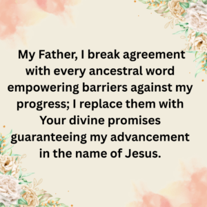 6. My Father, I break agreement with every ancestral word empowering barriers against my progress; I replace them with Your divine promises guaranteeing my advancement in the name of Jesus.