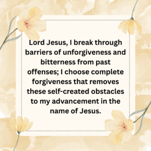 18. Lord Jesus, I break through barriers of unforgiveness and bitterness from past offenses; I choose complete forgiveness that removes these self-created obstacles to my advancement in the name of Jesus.